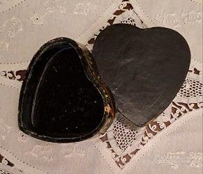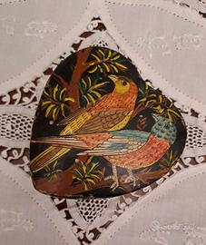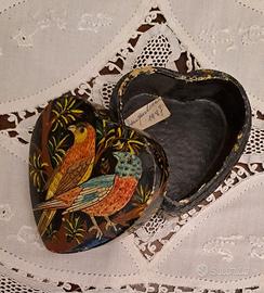 Deliziosa scatolina vintage in cartapesta a forma di cuore, dipinta a mano, decorata con disegni di uccelli colorati. Dimensioni: h.4 cm, diametro 8 cm, lunghezza 8 cm circa. Presenta qualche piccolo segno del tempo, ma in ottime condizioni.