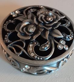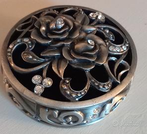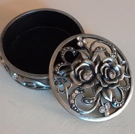 piccola scatola rotonda con un coperchio finemente lavorato.Il coperchio presenta decorazioni floreali a forma di rose e motivi a scorrimento, impreziositi da piccoli strass trasparenti.