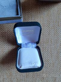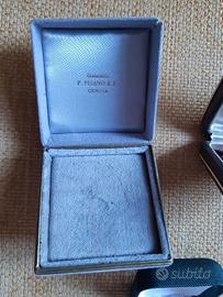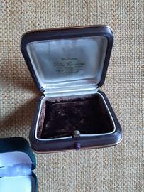 Tre astucci per gioielli antichi : uno marrone con imbottitura interna in raso e velluto alla base dell’antica gioielleria Pietro Gismondi Genova. Dimensioni cm. 7,3 x 7,3 x 3. Una verde con scritta interna Goldfiels Jewellers of Queenstown (Australia) interno bianco e imbottitura della base leggermente rovinata. Dimensioni cm. 5,4 x 4,6 x 3,3. Una grigia con imbottitura interna in raso e velluto alla base dell’antica gioielleria Pisano Genova . Dimensioni cm. 6,7 x 6,8 x 3. Le foto fanno parte integrante della descrizione