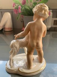 Statuetta vintage anni '50 in porcellana finemente dipinta a mano con colori favolosi, raffigurante un putto nudo, o un angioletto, che gioca con un agnello.