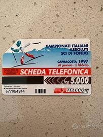 L'immagine mostra una scheda telefonica Telecom Italia da collezione, emessa nel 1997 per commemorare i Campionati Italiani Assoluti di Sci di Fondo tenutisi a Capracotta dal 28 gennaio al 2 febbraio.