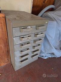 Schedario capiente, carrelli scorrevoli, senza chiave, segni di usura sulla verniciatura esterna, parzialmente da pulire e restaurare