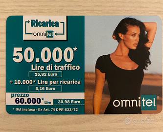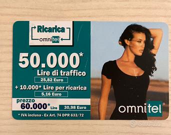Schede telefoniche “Omnitel” - Megan Gale, taglio da Lire 50.000 in ottime condizioni. Dicitura: Ricarica 7 omnitel® 50.000* Lire di traffico 25,82 Euro + 10.000* Lire per ricarica 5,16 Euro prezzo 60.000 *Lire 30,98 Euro * IVA inclusa - Ex Art. 74 DPR 633/72 omnitel