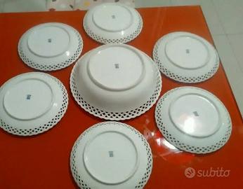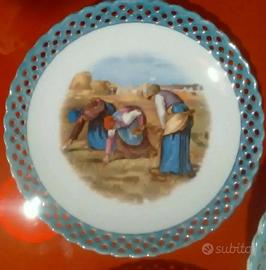 Raro Set da Portata Schumann Bavaria – Porcellana Traforata Anni '30 Pregiato set di Schumann Bavaria, prestigiosa manifattura tedesca, che si distingue per il raffinato bordo a cestello traforato (reticolato) in un delicato color azzurro polvere e per il decoro centrale d'ispirazione artistica Marchio Schumann Bavaria originale Origine Germania, Baviera Periodo Anni '30 Materiale Pregiata porcellana tedesca decorata. Soggetto Scena di vita rurale Le Spigolatrici (omaggio al celebre dipinto di Jean-François Millet) Lavorazione Bordo traforato a mano con finitura a contrasto Il set è composto da: - Piatto Grande / Alzata Diametro 23 cm - Altezza 6 cm (ideale come portafrutta o piatto da portata profondo) - 6 Piatti Piani / Piattini Diametro 17 cm circa (per dessert, antipasti o pane) La porcellana mantiene la sua lucentezza e i decori sono ben definiti Ottime condizioni generali come da foto recente