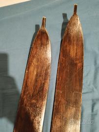 Gli sci sono in perfette condizioni, lunghezza 203 cm circa, con attacchi scarponi in metallo. Racchette in canne di bambu originali dell'epoca.