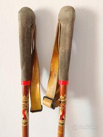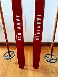 Corredati da bastoncini dell’epoca in bambù, stesso logo e marchio degli sci. Cinturino e impugnatura in pelle marchiato Jarvinen. Lunghezza 140 cm.