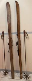 Sci anni 50 Emet, 1.95- 12227 fratelli Persenico Chiavenna, attacchi scarponi Kandahar Competition completi di racchette in metallo con impugnature in cuoio. Le condizioni generali sono buone gli attacchi metallici, le molle e tutto il complesso che li forma sono in buone condizioni senza parti mancanti. Il Legno è buono e presenta varie scalfitture segni dovuti al tempo niente di così compromettente si parla di rigature superficiali pochissimo profonde. una racchetta presenta lo stelo con leggerissime ossidazioni mentre l’altra racchetta presenta lo stelo più ossidato al centro.