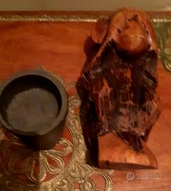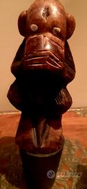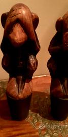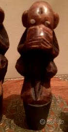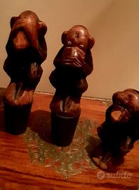 Deliziosa rappresentazione scultorea, in legno pregiato, delle celebri scimmiette "non vedo-non sento-non parlo".
