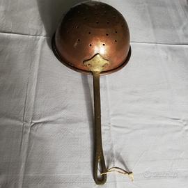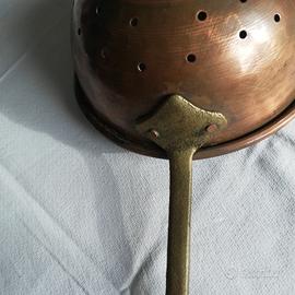 Vecchio scolapasta in rame con manico in bronzo, sempre rimasto appeso in cucina. Lunh tot 42 cm (manico 20) diametro 19 cm peso 570 gr.