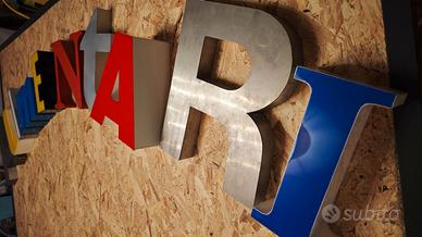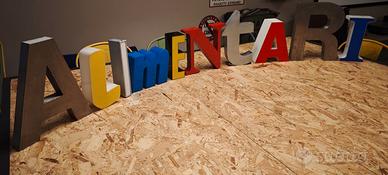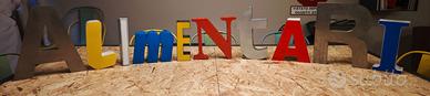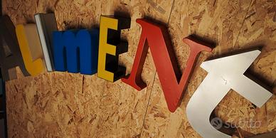 Scritta ALIMENTARI composta da 10 lettere di diversa altezza, colore e materiale, provenienti da insegne di attività dismesse. Bella idea di arredamento, possono essere appese ad es in un locale cucina o in un ristorante. Le lettere hanno altezza max 40 e Min 20cm, larghezza da 6 a 33 cm. La scritta, con un normale distanziamento, occupa circa 260 cm di larghezza. Materiale plastico e/o acciaio a seconda della lettera. Non sono presenti i retri delle lettere, sono quindi adatte idealmente ad essere appese ad un muro. Non si vendono lettere singole. Ritiro a mano Milano nord.
