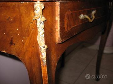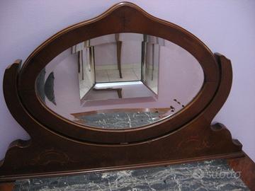Scrittoio toeletta antico con cassetto completo di specchiera ovale orientabile, mobile arricchito alla base di marmo, decori e intarsi vari, in ottime condizioni, misura lunghezza cm. 97 x profondità cm. 50 x altezza cm. 134, (altezza base 80 cm.) non si accettano spedizioni.