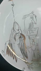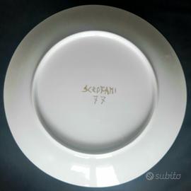 Piatto in porcella bianca decorato in oro da Scrofani nel 1977.