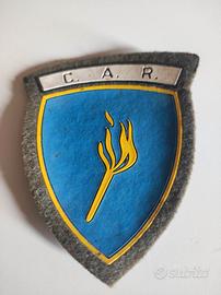 Autentico scudetto omerale dell'Esercito Italiano, risalente al periodo tra gli anni '70 e '80. Raffigura una fiamma stilizzata e l'acronimo C.A.R. (Centro Addestramento Reclute). Un pezzo classico di militaria italiana, ideale per collezionisti o appassionati di storia militare. Il materiale è in tessuto con applicazione in vinile/plastica, tipico dell'epoca.