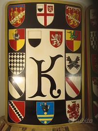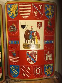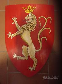 Il lotto si compone di 4 grandi palvesi ed uno scudo tutti a tema medievale senese. I 3 grandi palvesi rettangolari, alti poco più di 90 centimetri e larghi 60, riportano, divisi per ciascun terzo cittadino, gli stemmi di tutte le 42 compagnie militari in cui era suddiviso l’esercito senese medievale, perlomeno per quanto riguardava la fanteria. Il quarto palvese, alto 80 e largo 60 cm nel punto massimo, raffigura San Giorgio dopo che secondo la leggenda aveva catturato il drago. Lo scudo infine, alto circa 60 e largo 40 centimetri, riporta lo stemma del Popolo di Siena, un leone rampante bianco in campo rosso. Tutti i palvesi sono foderati e bordati di velluto. Tutti gli scudi hanno, sul lato interno, 4 robusti anelli di ferro. Gli scudi sono adatti sia come oggetti d’arredamento, sia come accessori per costumi, di balestrieri o palvesari, per ricostruzioni storiche o cosplay. Non sono adatti per giochi LARP, in quanto fatti con compensato molto spesso e quindi pericolosi se usati in combattimenti senza armatura, ciascun palvese rettangolare infatti pesa ben 8 chilogrammi, quello di San Giorgio poco meno. I 3 palvesi rettangolari non sono separabili e per tutti e 3 chiedo complessivamente 800 euro. Il palvese di San Giorgio può essere venduto separatamente e per esso chiedo 400 euro. Per tutto il lotto complessivo, cioè i 3 rettangolari più San Giorgio, chiedo 1.200 euro e regalo lo scudo del Popolo il cui valore può essere stimato fra i 70 ed i 100 euro. Inoltre, in qualsiasi formula di acquisto, regalo vari libri da me scritti, fra cui uno con la ricostruzione degli stemmi delle compagnie militari senesi. La spedizione è a mio carico.
