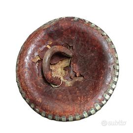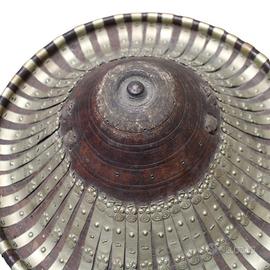 La superficie è decorata con fasce radiali alternate in metallo e materiale organico scuro (probabilmente cuoio o legno rivestito), fissate con piccoli rivetti visibili lungo tutta la circonferenza.