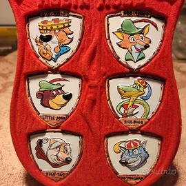 Scudo di Robin Hood completo (Topolino) con custodia rossa. Le medaglie erano allegate ai numeri da 1011 a 1016 di Topolino di fine anni '70, ritraggono Robin Hood, il Principe Giovanni, Little John, lo Sceriffo di Nottingham, Frà Tac e Sir Biss. Condizioni perfette.