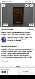 Scultura a rilievo in Bronzo di Giuliano OTTAVIANI – "Danzatrice Art Déco" – Anni '80 L'opera è passata anche su Catawiki nel 2021, ed è stata acquistata in asta, ad un prezzo di 660€. Allego screenshot nelle immagini, immagine numero 6 del passaggio in asta su Catawiki. Descrizione dell'Opera Splendido quadro-scultura a bassorilievo realizzato dal celebre maestro scultore, pittore e designer italiano Giuliano Ottaviani (Foligno, 1943). L'opera raffigura una figura femminile stilizzata in posa di danza, caratterizzata da linee fluide ed eleganti che richiamano lo stile Art Déco. La maestria di Ottaviani emerge nella capacità di conferire dinamismo e leggerezza a un materiale solido e nobile come il bronzo. Dettagli Tecnici Autore: Giuliano Ottaviani (firmato in basso a destra con marchio stilizzato dell'artista). Materiale: Bronzo fuso con rifinitura satinata. Supporto: Montata su base rettangolare con cornice in legno pregiato. Epoca: Fine anni '80 / primi anni '90. Condizioni: Ottime condizioni vintage, con bellissima patina naturale del tempo che ne attesta l'autenticità. Perché acquistare quest'opera? Giuliano Ottaviani è un artista di fama internazionale, noto per le sue opere monumentali e le sue collaborazioni nel mondo dell'oreficeria di lusso. Questo pezzo rappresenta un perfetto connubio tra arte e design d'interni, ideale per collezionisti o per chi desidera un elemento d'arredo di grande prestigio e valore storico-artistico certificato da recenti passaggi in asta (Catawiki).