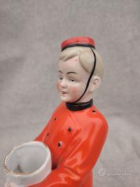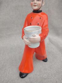 Bellissima, e sottolineo bellissima bottiglia risalente alla prima metà del 900 (probabilmente anni 20) tenuta molto bene. Ha un restauro al vaso visibile in foto ma oltre alla verniciatura di diversa tonalità la crepa è impercettibile e sembra quasi una sbavatura del tempo. La piccola crepa sul viso le conferisce quella patina retro e non è assolutamente un restauro o una rottura. Era probabilmente una bottiglia di liquore giacché la testa è un tappo, una parte del tappo è caduta dentro alla bottiglia ma ne rimane quanto basta per fissare la testa al corpo. Pucci Umbertide ha riproposto questa forma negli anni 40 ma la qualità della verniciatura ed i dettagli sono palesemente più scarsi rispetto a questo modello e più piccoli i "Boys", 20cm quelli di Umbertide mentre questa è di 22,5cm.