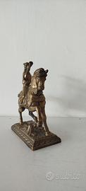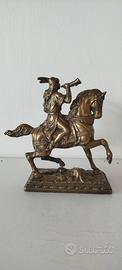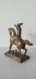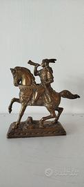 Scultura antica raffigurante il cavaliere Rolando di Roncisvalle sul suo cavallo al galoppo, con un corno in mano - In bronzo con patina dorata
