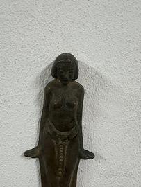 antico stile egizio, probabilmente un oggetto da collezione o decorativo. Presenta un manico scolpito a forma di figura femminile, che ricorda le divinità o le figure femminili dell'antico Egitto.