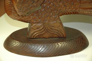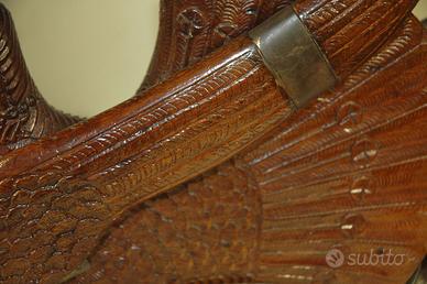 Scultura antica tacchino in legno di mogano, set porta coltelli, interamente e finemente intagliato a mano, origine Stati Uniti, periodo circa anni '40 -'50. 16 pezzi, le ali sono fornite di cerniera pieghevoli, da usare come soprammobile di bellezza e arredo, non per la cucina. Altezza 35 cm, lunghezza 38 cm, larghezza 20 cm.
