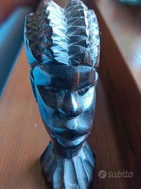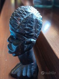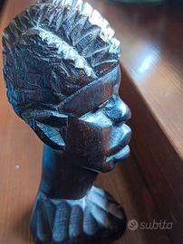 Scultura raffigurante una testa femminile, tipica dell'arte etnica africana. Intagliata a mano in legno di ebano. Risale agli anni 60/70 del secolo scorso e proviene dalla Costa d'Avorio. Dimensioni 10x5x4
