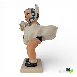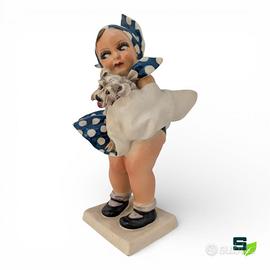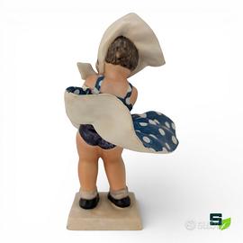 Rara e affascinante scultura in ceramica policroma firmata C. Mollica (Napoli/Torino, anni '30/40), raffigurante una bambina in costume da bagno blu a pois con cuffia coordinata. Tiene un tenero cagnolino tra le braccia mentre la gonna bianca svolazza mossa dal vento, catturando un momento giocoso e dinamico. Condizioni perfette, smalti vividi e dettagli curati.