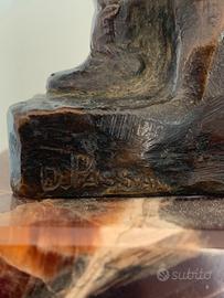 Antica e Rara Scultura in bronzo patinato raffigurante "Bambina con Pinocchietto", poggiante su base in marmo alabastro con venature; reca firma alla base con nome dell’artista D.Passani -