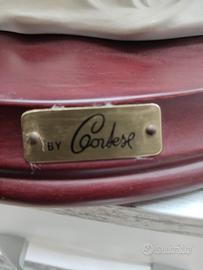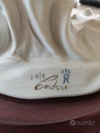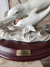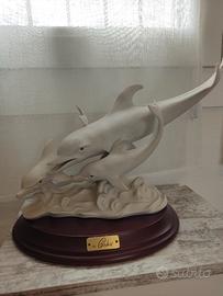 Scultura firmata by Cortese...unica! Dimensioni: H: 23,5 cm P: 19 cm L: 30 cm Peso: kg. 2,05 Definizione Generale Questa è una statua decorativa in stile Capodimonte, raffigurante un pod di delfini, firmata dall'artista Cortese. Analisi dei Dettagli Ecco una scomposizione degli elementi chiave visibili nell'opera: 1. Soggetto: È una scultura figurativa a tema naturalistico/marino. Raffigura una famiglia o un gruppo di tre delfini che "saltano" fuori dalle onde. Il delfino più grande è l'elemento centrale, fiancheggiato da due delfini più piccoli, creando una composizione dinamica e armoniosa. 2. Lo Stile e il Materiale: Il materiale è porcellana bisquit (o "bisque") finemente lavorata. Si tratta di una porcellana bianca opaca, non smaltata, che conferisce alla scultura un aspetto setoso e una consistenza realistica, evidenziando ogni dettaglio dei muscoli e della pelle degli animali senza riflessi lucidi. Lo stile è tipico dell'Artigianato Italiano di Capodimonte del XX secolo, caratterizzato da un forte realismo, attenzione al dettaglio anatomico e un tocco di eleganza teatrale. 3. Autore e Autenticità: La base ovale in legno scuro lucido presenta una targhetta in metallo ottonato con la dicitura "BY CORTESE". Come menzionato nell'introduzione precedente, questo si riferisce con ogni probabilità a Germano Cortese, noto per queste sculture decorative di alta qualità in stile Capodimonte, spesso montate su basi di legno e firmate in questo modo. In Sintesi: Che cos'è? Si tratta di un pezzo da collezione originale italiano, realizzato in pregiata porcellana bisquit e risalente probabilmente alla metà o alla fine del XX secolo. Non è una scultura astratta o moderna, ma un esempio classico e ben eseguito di arte figurativa decorativa italiana.