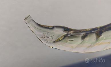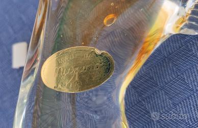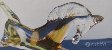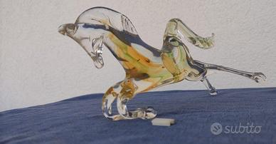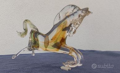 Pregiata scultura in vetro di Murano (made in Italy), che riproduce un cavallo in posa rampante, con inclusioni di bollicine e strisce colorate che vanno dal color ambra al verde. La scultura è provvista di bollino originale riportante la scritta : murano - made in Italy. Le misure sono: 24 cm di lunghezza x 10 cm di altezza massima x 4 cm di spessore circa. Descrizione delle condizioni. Strutturalmente integro. Si segnala una scheggiatura del vetro sulla punta della coda (visibile in foto). Inoltre per un difetto di progettazione (non per una rottura), la zampa anteriore destra non è allineata in altezza alla zampa anteriore sinistra per cui occorre posizionare un piccolo spessore perché sia in asse quando lo si appoggia su un piano (anche questo difetto è visibile in foto). Su richiesta fornisco foto dettagliate dell'oggetto.