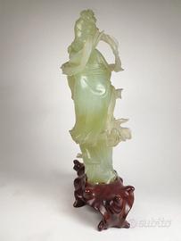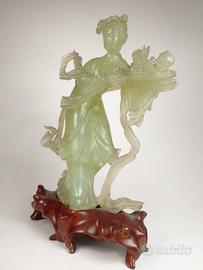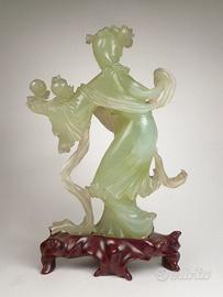 Scultura cinese in Giada Nefrite Celadon - fine XIX/Inizio XX sec. Descrizione: In vendita una raffinata scultura orientale d'epoca, capolavoro di intaglio artigianale realizzato in vera Giada Nefrite naturale di una delicata tonalità verde Celadon, è tipica della maestria artigianale del periodo della Repubblica (1912-1949). L'opera raffigura una fanciulla celeste (identificabile con l'Immortale He Xiangu), colta in una posa fluida e dinamica. Tra le mani reca la Pesca della Longevità e il Melograno, simboli beneauguranti di immortalità e prosperità familiare. CARATTERISTICHE TECNICHE: Materiale: Giada Nefrite naturale al 100%. La pietra presenta una splendida traslucenza in controluce e la tipica tessitura interna "nuvolosa" che ne garantisce l'autenticità (non è resina, non è vetro). Condizioni: La scultura è totalmente INTEGRA, senza sbeccature, crepe o restauri, anche nei dettagli più fragili come le dita e i petali dei fiori. Base: Poggia sulla sua base originale in legno pregiato, finemente intagliata a mano su misura per incastrarsi perfettamente con la scultura. Dimensioni: Altezza totale con base 19 cm.Peso: 428 grammi (consistente e solida). SPEDIZIONE:L'oggetto verrà imballato con estrema cura professionale