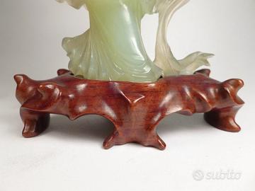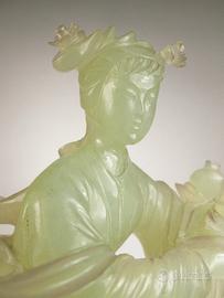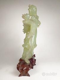 Descrizione: Scultura orientale d'epoca, capolavoro di intaglio artigianale realizzato in vera Giada Nefrite naturale di una delicata tonalità verde Celadon, è tipica della maestria artigianale del periodo della Repubblica (1912-1949). L'opera raffigura una fanciulla celeste (identificabile con l'Immortale He Xiangu), colta in una posa fluida e dinamica. Tra le mani reca la Pesca della Longevità e il Melograno, simboli beneauguranti di immortalità e prosperità familiare. Condizioni: La scultura è totalmente INTEGRA, senza sbeccature, crepe o restauri, anche nei dettagli più fragili come le dita e i petali dei fiori. Base: Poggia sulla sua base originale in legno pregiato, finemente intagliata a mano su misura per incastrarsi perfettamente con la scultura. Dimensioni: Altezza totale con base 19 cm.Peso: 428 grammi (consistente e solida).