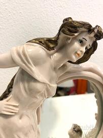 Scultura in polvere di marmo stile Liberty con specchio firmata Del Vecchio risalente alla prima meta degli anni 80; dipinto a mano e con specchio recante motivi floreali incisi non presenta alcun difetto fatta eccezione per qualche segno sul piedistallo in legno. Dimensioni ingombro 19x16cm h35cm, specchio 14x10cm circa. Spedizione possibile con garanzia; se non arriva sana rimborso il 100%. Scrivetemi solo se realmente intenzionati. Vigonza - Padova.