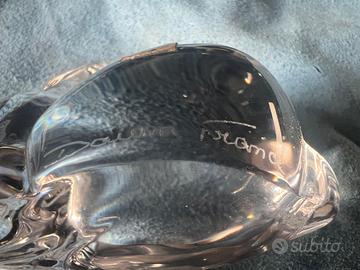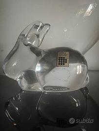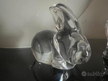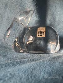 Vendo splendida scultura raffigurante un coniglio in pregiato cristallo pieno, realizzata dalla storica manifattura francese Daum France. L'oggetto è un pezzo di design iconico, caratterizzato da linee morbide e moderne che giocano con la luce in modo straordinario, tipico dell'altissima qualità del cristallo di Nancy. Marca: Daum France (originale). Firma: Presente sia l'adesivo originale "Cristal Daum" sia la firma incisa a punta di diamante sulla base. Materiale: Cristallo trasparente ad alto indice di rifrazione. Condizioni: Eccellenti, pari al nuovo. Non presenta scheggiature, graffi o opacità (sempre tenuto in vetrina).