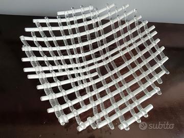 Una elegantissima scultura da centrotavola in vetro soffiato, realizzata a strisce, utilizzabile anche come coppa per la frutta, del maestro vetraio Massimo Lunardon, interprete per il vetro dei principali artisti internazionali. Produzione dei primi anni 2000. Conservazione eccellente. Diametro: 42 cm x H.9 cm