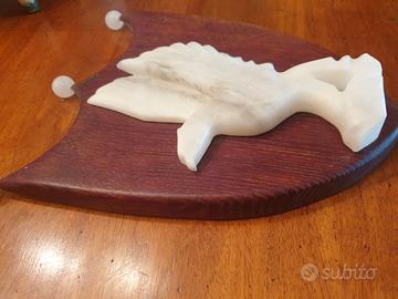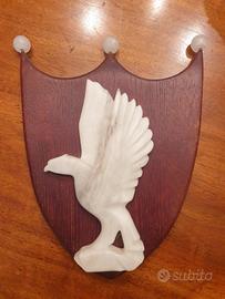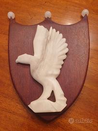 Bella scultura/crest con base in legno e soggetto in alabastro di Volterra, anni '90. Opera scolpita a mano da maestro alabastraio, anche il supporto in legno è interamente fatto a mano. Scultura riproducente un'aquila. Bellissime le venature della pietra utilizzata. In perfette condizioni.