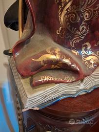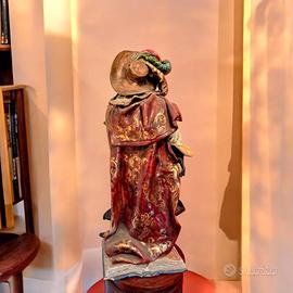 scultura in ceramica rappresentante il Cyrano de Bergerac (moschettiere e poeta da qui la base a forma di libro) di Paolo Mariani scultura degli anni 50 circa dipinta a mano con dettagli dorati ,altezza 70 cm piccola "sbeccatura" ad angolo a sinistra della base del libro