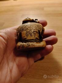 Piccola scultura raffigurante probabilmente Daikoku, una delle sette divinità della fortuna nel pantheon giapponese. L'oggetto è realizzato in materiale simile all'avorio e presenta dettagli finemente intagliati.