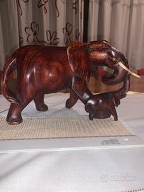 L’elefante è rappresentato in posizione dinamica, con proboscide ricurva e cucciolo sotto la protezione dell’adulto: una scena simbolica che richiama forza, protezione e prosperità. Le superfici mostrano una patina calda e profonda, tipica degli oggetti lavorati a mano e maturati nel tempo.