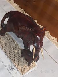 In vendita scultura raffigurante elefante, realizzata in legno massello finemente intagliato, con zanne applicate (materiale chiaro naturale), lavorazione artigianale di grande impatto visivo.