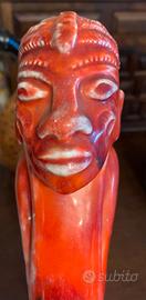 probabilmente ceramica rossa o marmo rosso venato,con venature chiare naturali visibili su tutta la superficie.Lavorazione interamente manuale,superficie levigata e lucida.Presente firma incisa a mano sul lato inferiore(visibile in foto),che conferma la natura artigianale del pezzo.Stile riconducibile all’arte etnica africana reinterpretata in chiave modernista, seconda metà del XX secolo.Misure:Altezza cm 44..Larghezza cm 20.Base cm 23.