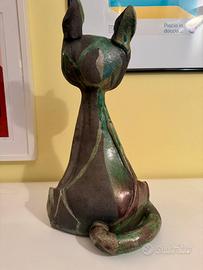 La figura rappresenta un gatto totemico stilizzato, con forme allungate e presenza verticale dominante.
