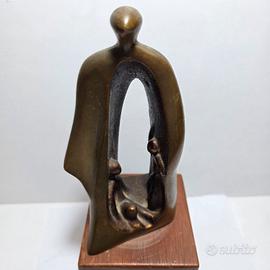 Scultura in bronzo astratta modernista con base in legno. Opere dal significato simbolico di protezione e famiglia. Vediamo una figura grande che tiene al suo interno, come fosse un guscio, delle figure più piccole, come se fosse i suoi figli.