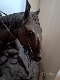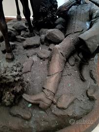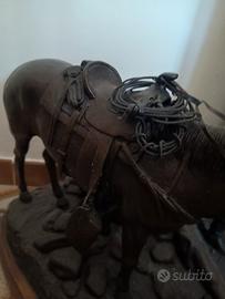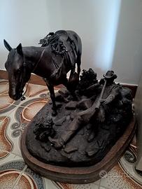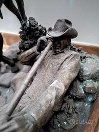 Una lunga corda e un telescopio Artista: Frank Polk, CA (1908-2000) Descrizione:Bronzo (1975) | Dimensioni: 17"h x 16"w x 14"d; Edizione 12 di 35 Frank Polk aveva una naturale capacità di catturare cavalli e uomini in formati tridimensionali. Le sue sculture sono realistiche e sempre autentiche in termini di abbigliamento e attrezzatura. Questa scena di un cowboy sdraiato contro una grande roccia che scruta attraverso un telescopio è la quintessenza dello stile di Polk, così come del suo talento scultoreo. Il cavallo in piedi cattura perfettamente l'immagine di un pony da lavoro. Non c'è dubbio che Polk abbia attinto a una vita di esperienze colorate che ha riversato nei suoi interessi artistici. Dopo la sua nascita nel Kentucky nel 1908, la famiglia Polk si trasferì nel Territorio dell'Arizona nel 1911, un anno prima che l'Arizona ottenesse lo status di stato. Iniziò a esibirsi nei rodeo con il suo asino addestrato alla tenera età di dieci anni e continuò per vent'anni. A quindici anni, si dedicò anche al cowboy "quando non c'erano recinzioni e il bestiame era selvaggio". Una volta ebbe un suo programma radiofonico di canto da cowboy, lavorò nei film western come stuntman, era un tipo Nel 1946, Frank Polk fu eletto miglior cowboy a tutto tondo. Incoraggiato dagli amici, riuscì a trasformare il suo hobby di intaglio in una vera e propria scultura in legno di tiglio. Studiò seriamente l'anatomia e si avvalse della sua esperienza per ritrarre ciò che conosceva meglio: la vita da cowboy. Iniziò infine la transizione dal legno alla cera, in modo che le sue opere potessero essere fuse in bronzo. I collezionisti rimasero affascinati dalla sua autenticità, personalità e dal suo lavoro. Nel 1967 fu invitato dal suo amico e membro fondatore, Joe Beeler, a unirsi ai Cowboy Artists of America