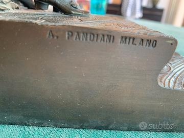 Scultura in bronzo in perfette condizioni, misure 35cm x40 cm di Antonio Pandiani (Milano, 1838 - 1928). studia all'Accademia di Brera diventando ben presto uno scultore di successo dallo stile accademico, noto per i suoi ritratti, come quello in bronzo di Alessandro Manzoni. I suoi pezzi, presenti in alcuni musei e prestigiose residenze, si trovano in vendita solitamente nelle case d'asta di fascia alta (Sothebys, Christies, Londra & New York), sempre con performance notevoli.