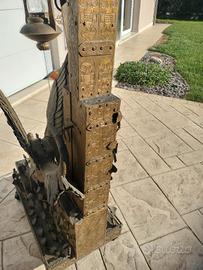 L’opera presenta una struttura verticale articolata: alla base ungrifo alato(creatura mitologica con corpo leonino e testa d’aquila) finemente lavorato nei dettagli delle piume e della muscolatura, poggia su una base decorata con elementi ornamentali e ruote integrate per lo spostamento.