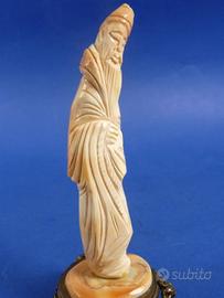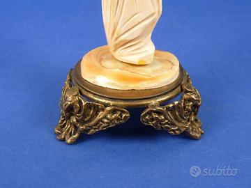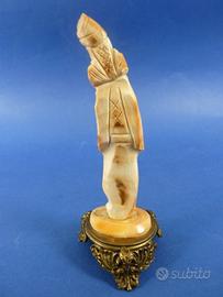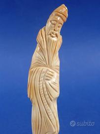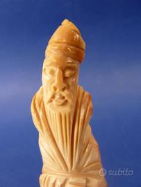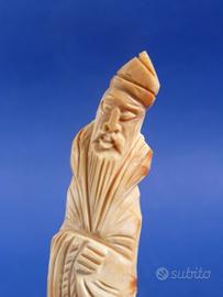 Statuina orientale scolpita su conchiglia raffigurante monaco barbuto con tunica e copricapo.