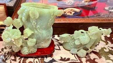 Scultura cinese in giada verde su base in legno . La scultura ha un motivo floreale e si scompone in due parti (vedi foto 3), nessuna rottura o scalfittura. Preferibile ritiro in loco. Prezzo su richiesta.