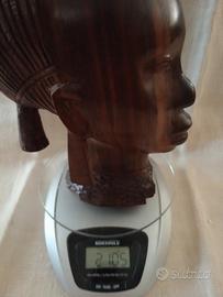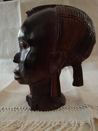 Bellissima scultura in legno di Ebano molto scuro con striature più chiare .Il busto, di grandi dimensioni è finemente scolpito e rappresenta una bellissima donna Masai. Origine Tanzania /Kenia . Risale alla 1^ metà del XX secolo . La testa è in perfette condizioni MA alla base ha un PEZZETTO MANCANTE ( che nulla toglie alla bellezza del manufatto) . Visualizzare bene le fotografie per verificare lo stato di conservazione e le misure.