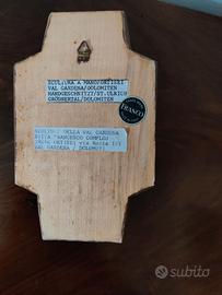 Immagine sacra di legno intagliata e dipinta a mano, vintage. Proviene da Ortisei, Val Gardena. Le etichette indicano che l'opera è stata realizzata dalla ditta Francesco Colmploj e presenta un bollino rotondo con il marchio di qualità.